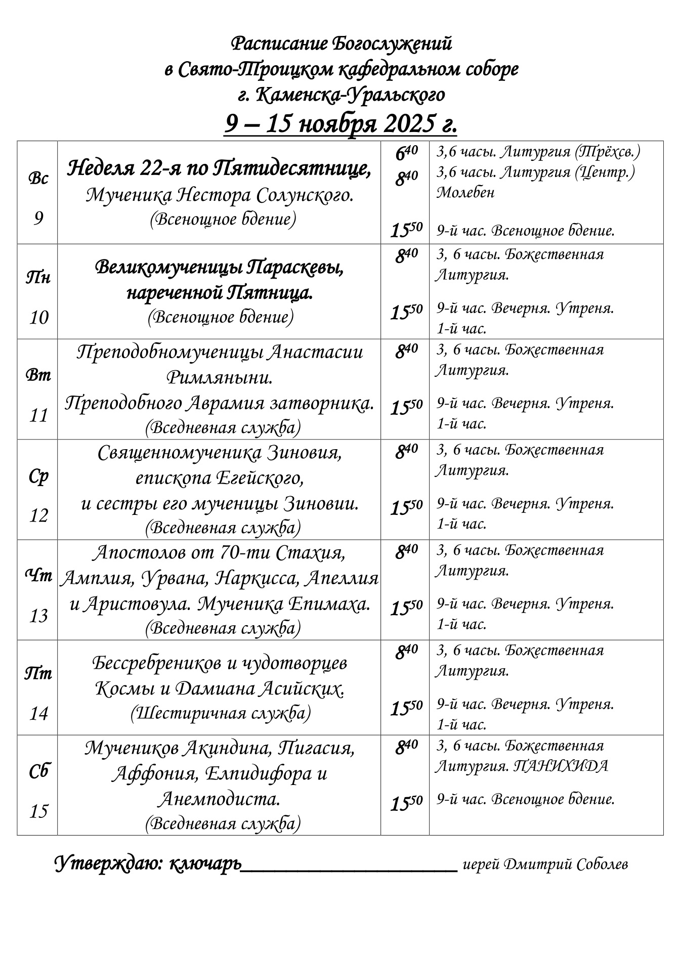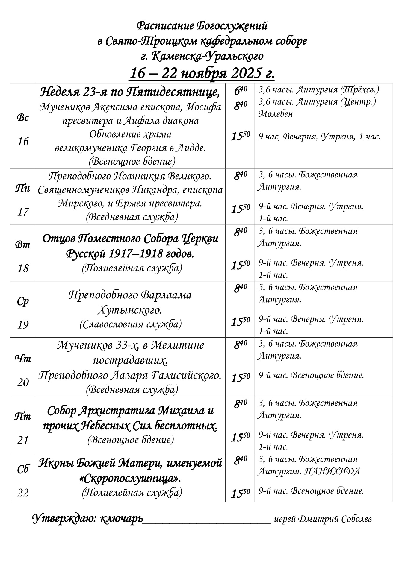 *В воскресные дни служится две Божественные Литургии: ранняя — в 6:40 и поздняя — в 8:40.