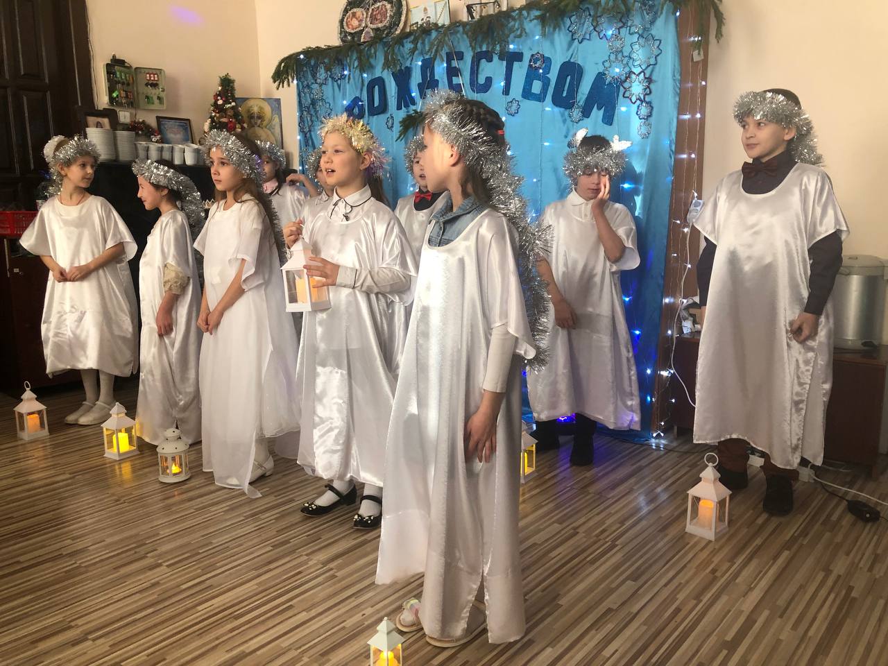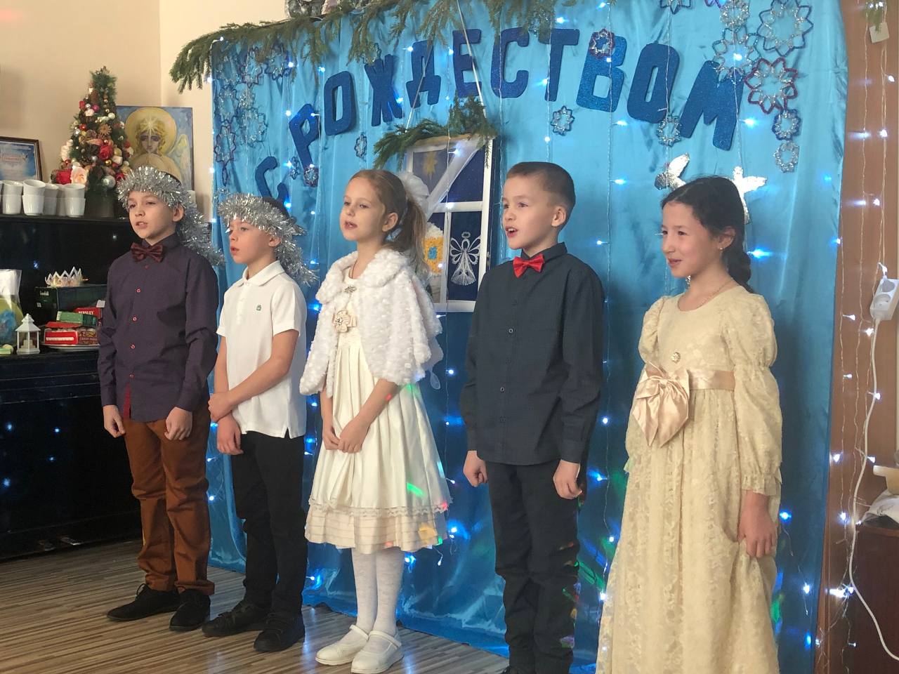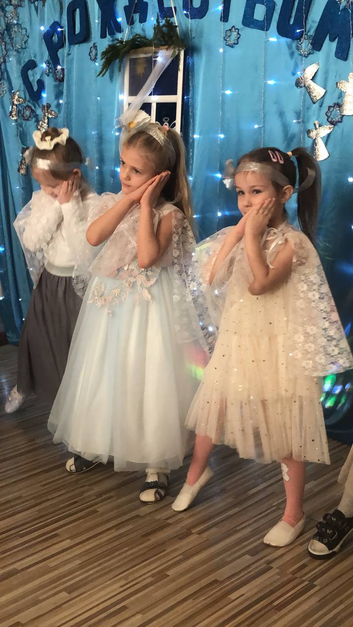 Элегантные мальчишки и шуршащие нарядными платьями девчонки. Все ребята в радостном волнении, на лицах у всех улыбки. Начали с Рождественского тропаря и понеслось – танцы, сценки, песни, колядки и, конечно же, подарки и праздничный стол.