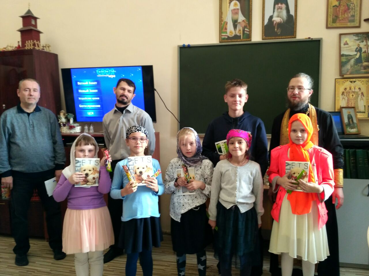 Совместная трапеза, краткий молебен на начало учебного года и, по традиции, – увлекательная викторина "Своя Игра". Ребята разделились на четыре команды, капитанам которых стали выпускники и самые старшие воспитанники школы. Вопросы были самые разные. Чтобы ответить на них, нужно было хорошо знать Ветхий и Новый Завет, Православное богослужение, устройство православного храма, церковно-славянский язык. Несмотря на трудные задания, ребята справились довольно успешно. Никто из участников не ушел без подарка, ведь в соревнованиях и конкурсах в нашей школе всегда побеждает дружба.