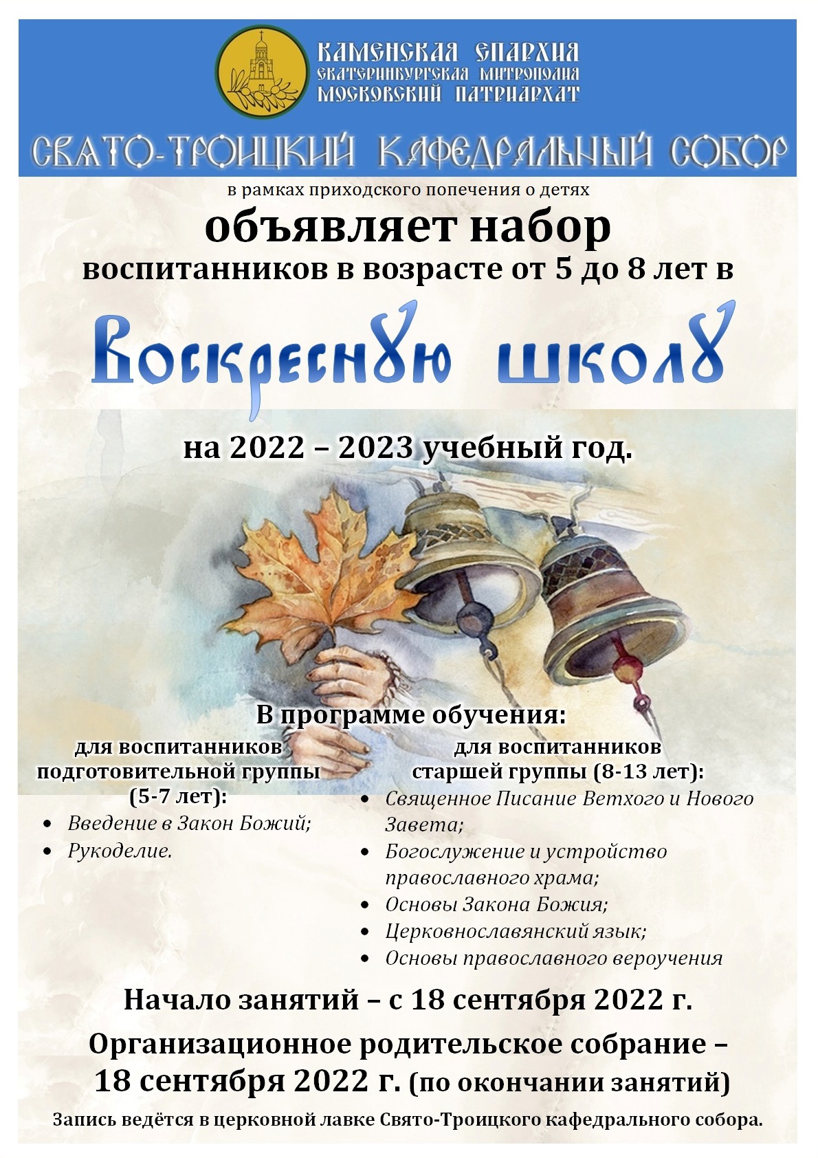 Свято-Троицкий кафедральный собор г. Каменска-Уральского объявляет набор воспитанников в Воскресную школу на 2022-2023 учебный год.