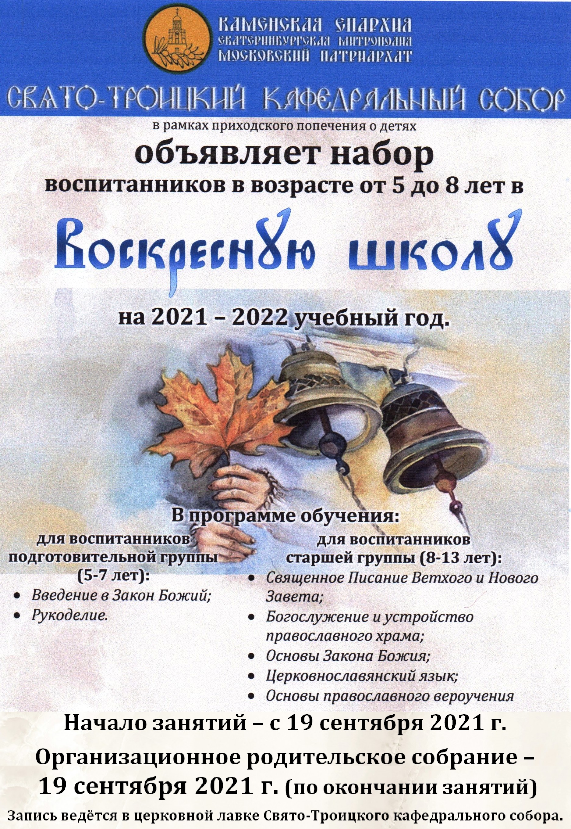 Свято-Троицкий кафедральный собор г. Каменска-Уральского объявляет набор воспитанников в Воскресную школу на 2021-2022 учебный год.