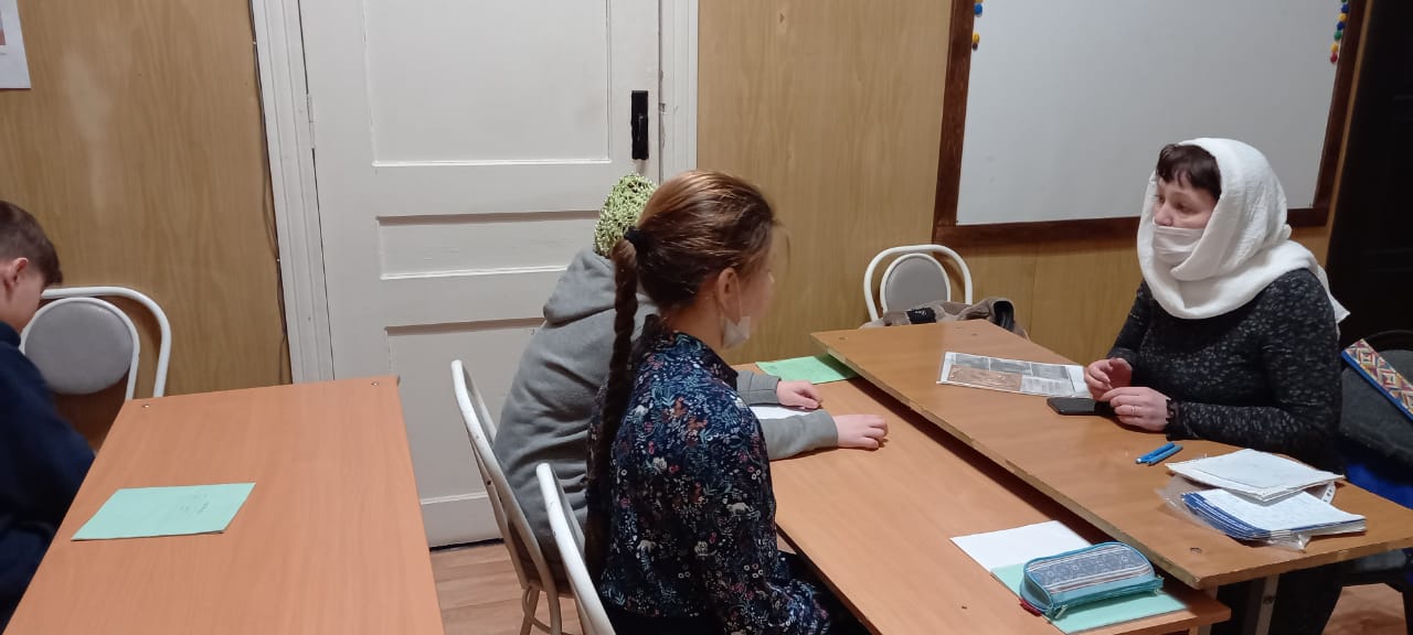 А вот и другой урок у воспитанников постарше. Преподаватель Юлия Владимировна Андросенко увлекла ребят рассказом о храме в честь Тихвинской иконы Божией Матери в селе Рыбниковское.