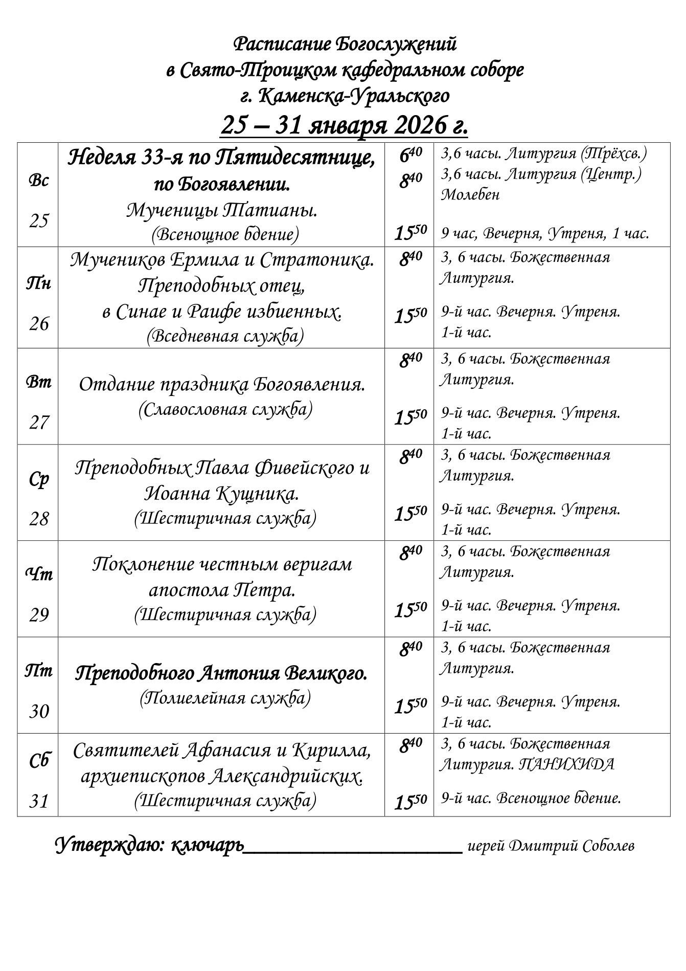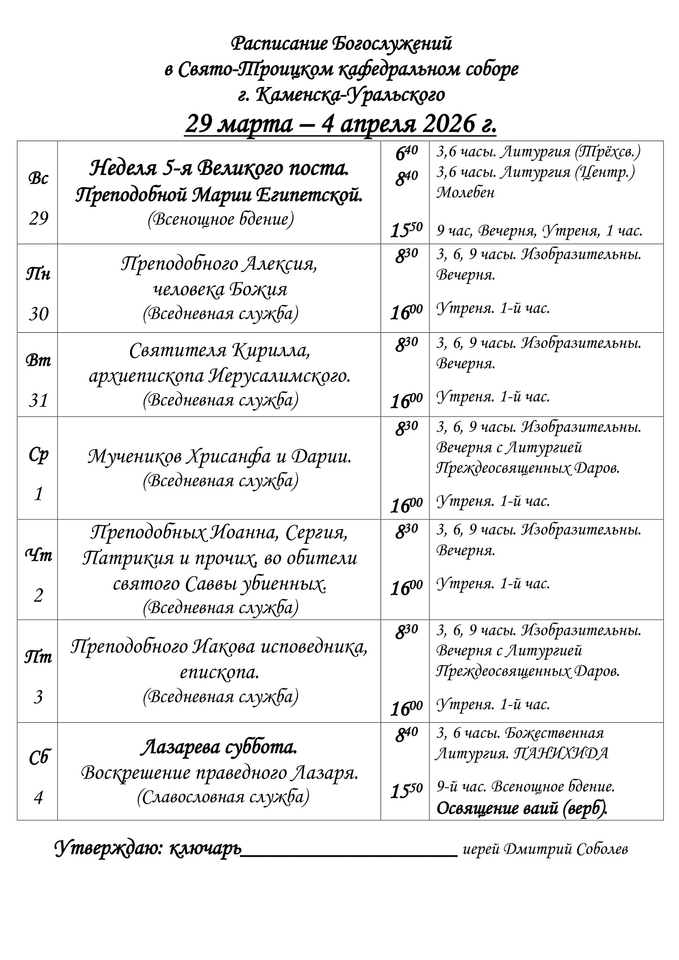 *В воскресные дни служится две Божественные Литургии: ранняя — в 6:40 и поздняя — в 8:40.