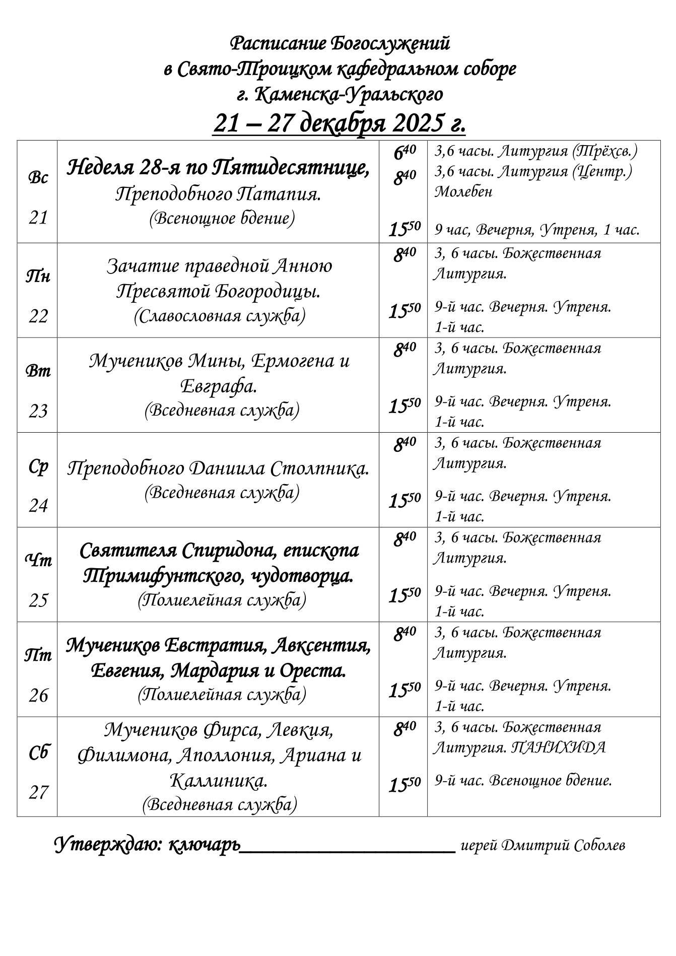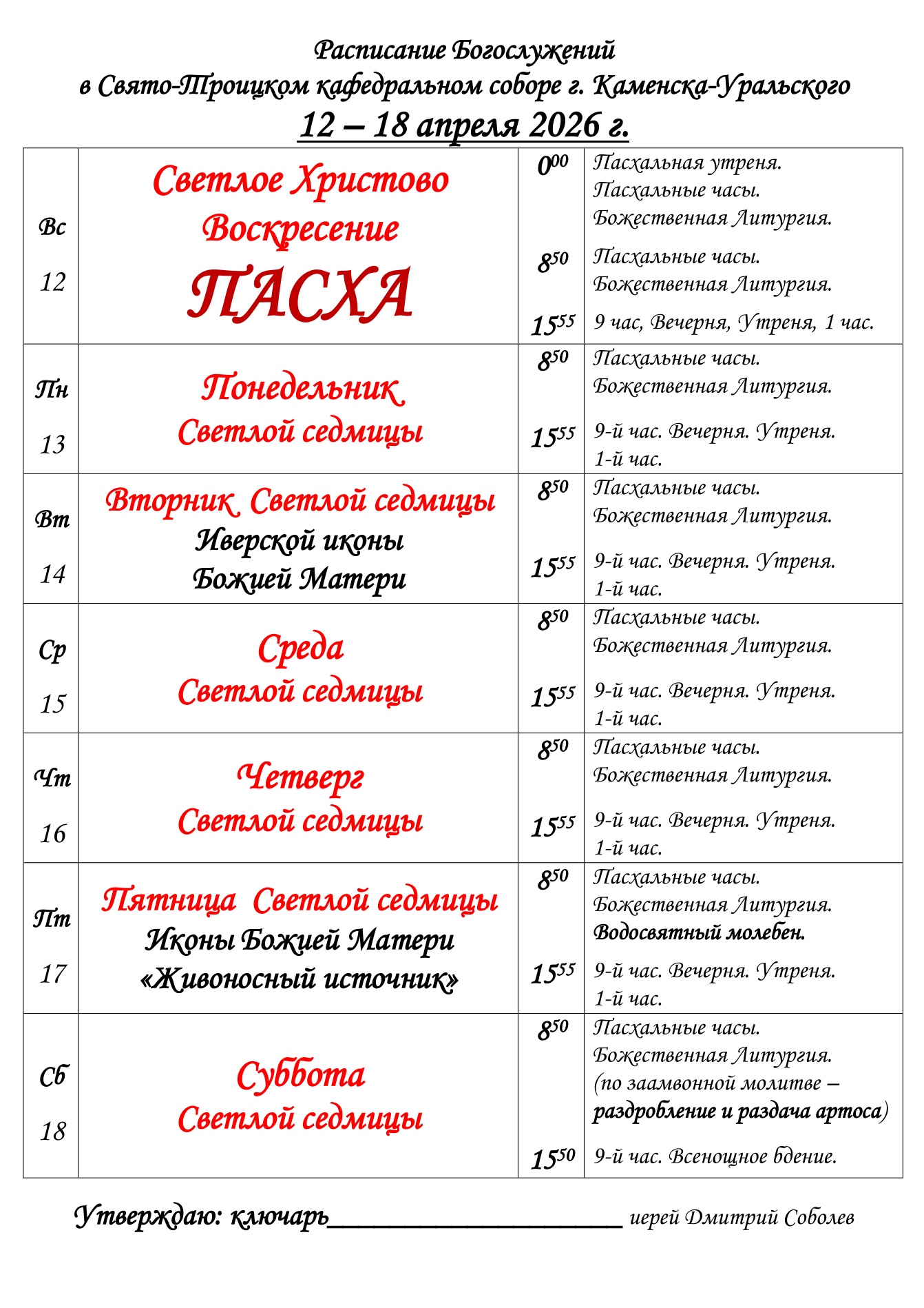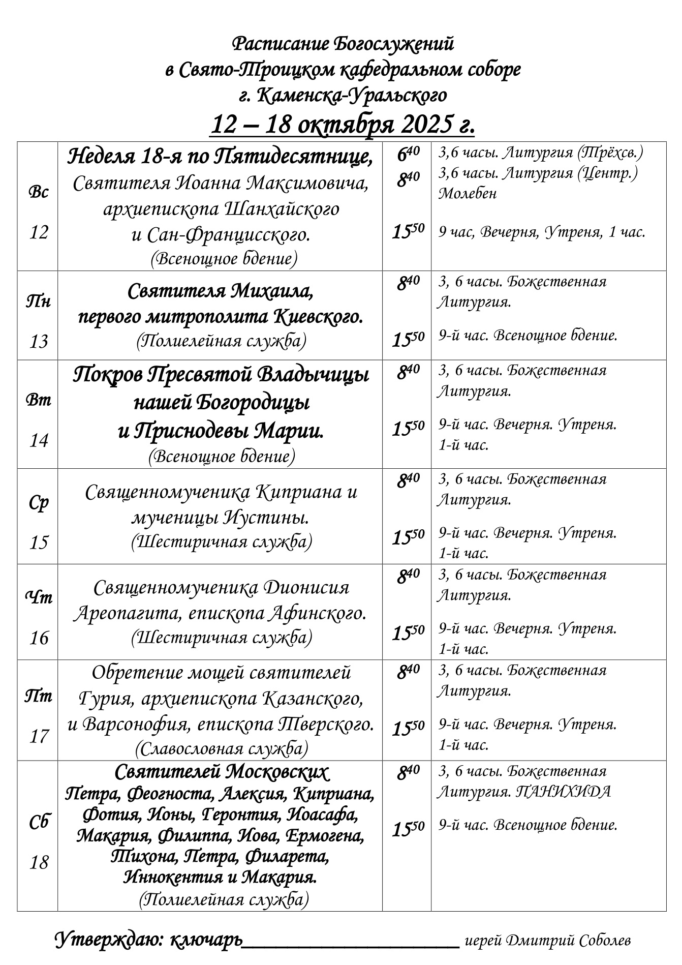 *В воскресные дни служится две Божественные Литургии: ранняя — в 6:40 и поздняя — в 8:40.