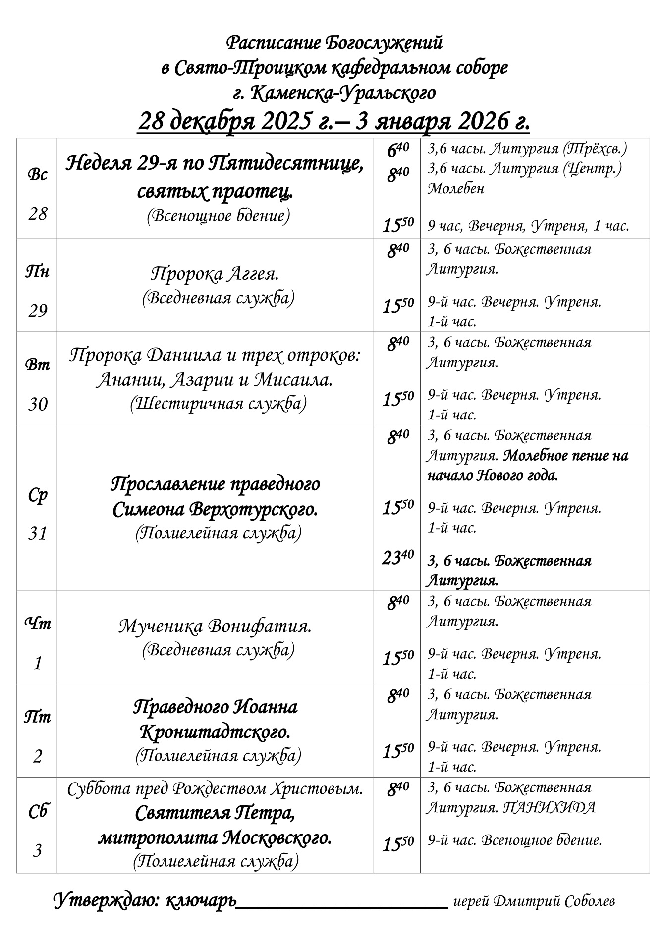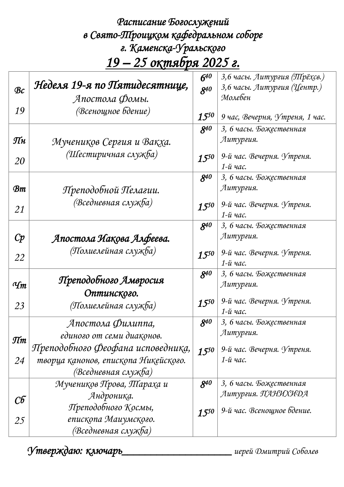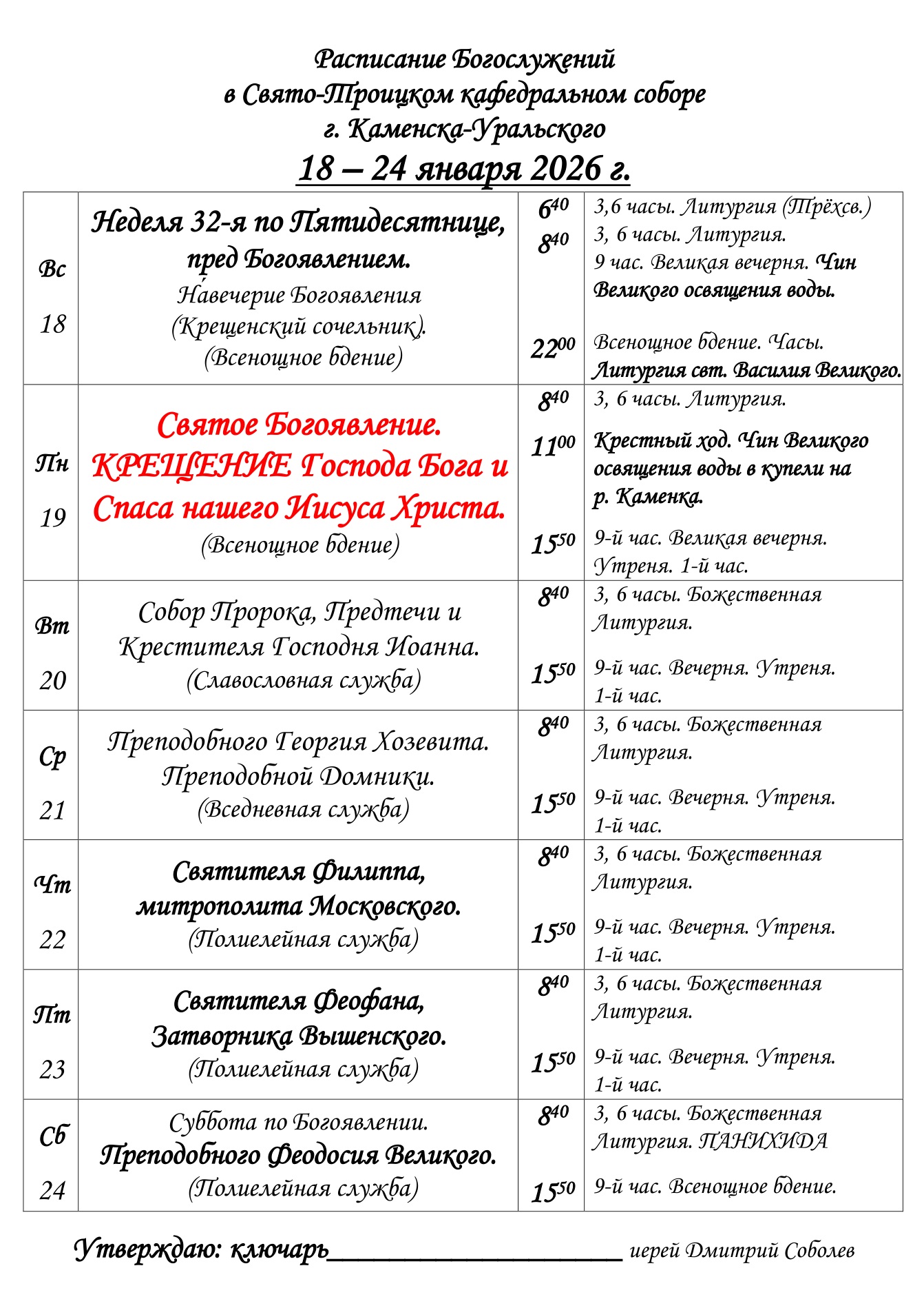 *В воскресные дни служится две Божественные Литургии: ранняя — в 6:40 и поздняя — в 8:40.