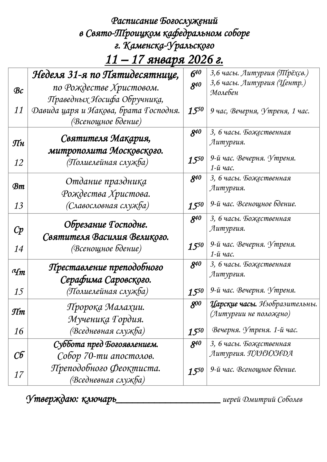 *Исповедь совершается ежедневно во время вечернего богослужения, начало молитв перед Исповедью в 15:40.
